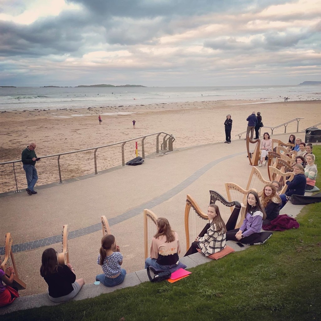 This year for National Harp Day, seventeen harpers from Causeway Harp School gathered together at the beautiful East Strand in Portrush, County Antrim to play in ensemble together.